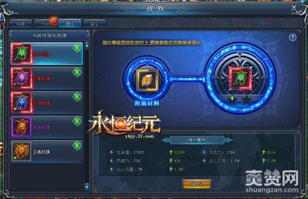 如果觉得升级战旗还不足以满足对实力的追求,37《永恒纪元》页游版的玩家可以使用强化石,强化对应的战旗以及部位,如有需要,玩家可放心更换战旗,无须考虑是否浪费材料,更换后的战旗将继承强化等级。