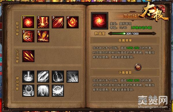 玩家获取“武功秘籍”后,即可激活相应技能。职业技能激活后,通过提升技能熟练度,便可提升技能等级,增加技能伤害。心法技能作为唯一一个全屏技能,不仅伤害强力,而且特效酷炫。另外,修习被动技能,可以永久增加人物的攻击、防御及生命属性。
