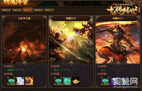 贪玩传奇世界网页版《龙腾传世》最与众不同的就是增添了神魔活动。陈小春和刘烨双星代言更是让玩家激情无限,点燃了熊熊战火。神魔BOSS,神魔任务,王座争夺战,三重任务充满你的世界。想要打BOSS,爆宝物箱子,没有问题。想要充实的日代表常,赚取丰厚的金币,这个也能满足你。想要激情PK,争夺那代表无上荣耀的王座,把对家踩在脚下,神魔大战正是你想要的那一个。马上就是贪玩三周年了,风清气正是永恒不变的主旋律,大家也可以期待更多更好玩的福利从天而降来到你的身边。