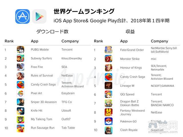 市场调查机构App Annie近日公布2018年iOS App Store用户及Google Play用户第一季度下载量及销售排行。