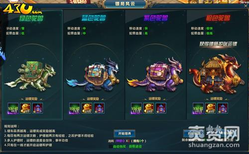 43u《武动乾坤》镖局风云活动会在每天的13:00-13:30开启,达到66级的玩家都可以参与,活动中,玩家可以押送速度从低到高依次为绿色、蓝色、紫色和橙色四种品质的驼兽,如果没有免费次数可以消耗元宝传送,开启黄金VIP尊享空间祖符无限传送特权哦!