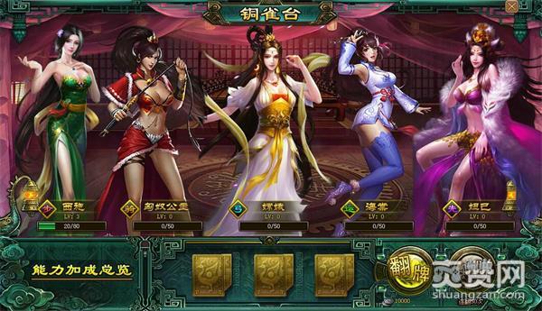 美人如云的铜雀台,还能为你增强兵种的特殊属性,每当玩家翻拍时翻到相应的美人既可以为美人增加经验,美人的等级提升可以让兵种的属性大大增加,每个美人加成的兵种各不相同,雨露均沾才是王道哦!
