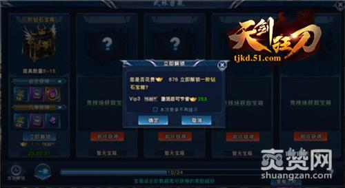 天剑狂刀中当玩家完成主线任务后,将开启且获得赠送的青铜宝箱,解锁宝箱需要消耗时间,不同的宝箱品质,消耗的时间也有所不同,没耐心等待的玩家可以选择花费元宝立即解锁宝箱,同一个时间内只能解锁1个。VIP1及以上的用户会在闲置时间内对宝箱从左至右依次自动解锁,即离线时间可自动解锁宝箱。