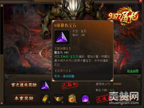 玩家成功通关9377屠龙战记天关副本后,可获得一些金条、绑定元宝、1级宝石包、装备精华奖励。副本重数越高,奖励的数量会越多的。玩家首次通关各重天关副本,还能领取到相应的宝石。