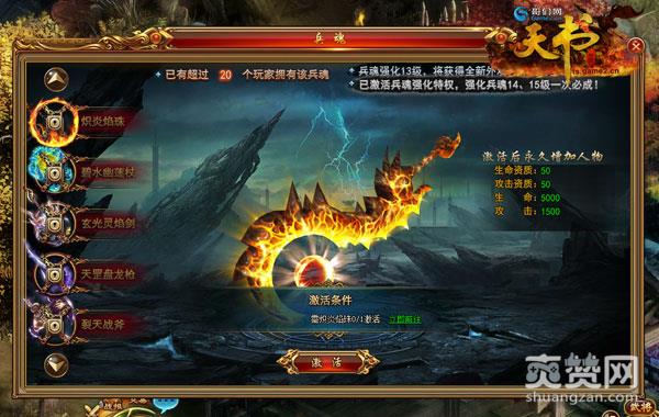 在哥们网《天书世界》灵体系统,玩家解锁神兵孔位,装备专属兵魂,兵魂属性翻倍;而且在神兵玩法中,当玩家激活了兵魂圣王战镰、萤火流光、青龙偃月刀、寒冰魄灵、炽炎焰珠即可获得组合技能——二郎神附体伤害增加100%!