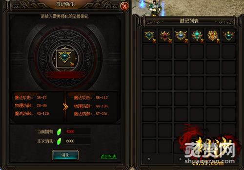 此外圣兽徽记还可以在卧龙NPC方角处进行强化,强化过程需要消耗圣兽精华,通过强化的圣兽徽记可以增加徽记基础属性。对于多余的圣兽徽记也可以在此回收,除了能够获得一定数量的圣兽精华,还能够获得绑定金币哦。