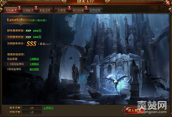 经验副本:可获得大量经验来给自己的职业升级,如果进副本时使用1.5倍/2倍经验石、经验熊猫获得的经验会更多,经验副本每天可进入3次,VIP玩家可以额外购买2次。