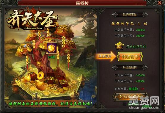 2、铜币:玩家在线时间越长,就能通过摇钱树获得更多铜币,还有机会免费获得摇钱果,提升摇钱树的等级