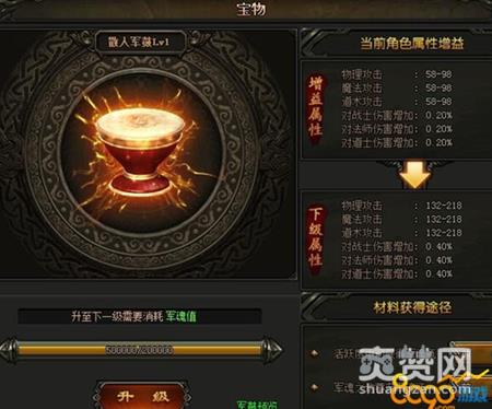 黄金特权玩家可获得200%加成。但是想要获取军魂值,背包必须有军魂瓶才能收集,军魂瓶可以在活跃度系统获得。除了活跃度,还可以通过每日充值、击杀军魂之地BOSS、庆典活动的充值特惠以及神秘商店刷新购买。最后军魂瓶收集满后点击使用,即可在宝物界面升级军鼓。