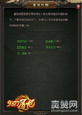 想要进入重装地图,要先在9377屠龙战记热砂荒漠里找到对应的NPC, 重装地图总计分为5层,每层地图都有不同的转生等级限制,当然玩家想要进入地图还需要缴纳一些些绑定元宝才可传送。