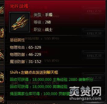 龙吟战镯。2转手镯。物理攻击提升65-329,物理防御提升46-229,魔法防御提升31-152。