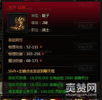 龙吟战靴。2转鞋子。物理攻击提升52-131,物理防御提升103-256,魔法防御提升68-171。