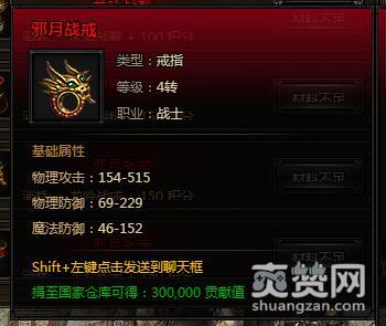 邪月战戒。4转戒指。物理攻击提升154-515,物理防御提升69-229,魔法防御提升46-152。