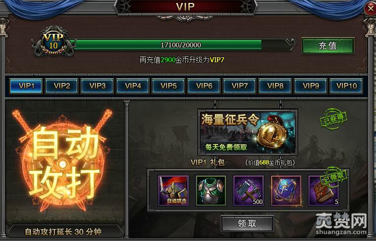 自动进攻延长半小时(总时间为1小时)。时间延长后,打BOSS占要道会非常给力。特别是前期等级低战力低,需要源源不断地输送部队上前线时,在这个延长半小时奖励加护下,会变得非常地实在。但是玩家朋友记得,自动攻打时,把征兵令不足自动消耗金币关掉哦。否则你的金币怎么少了,到时候可别怪小编没提醒过哦。