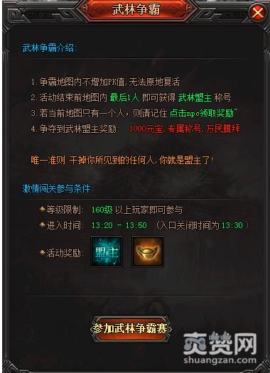《炎龙传奇》武林争霸活动时间:13:20-13:50;玩家参与条件是角色等级达到80。活动入口在威龙城-武林争霸的NPC处。活动开启10分钟内可进入活动地图,10分钟之后入口关闭。从活动入口关闭至活动结束,期间内地图中只剩最后一个人可申请成为武林盟主,成为武林盟主后可获得奖励 ——“武林盟主”称号、1000元宝。