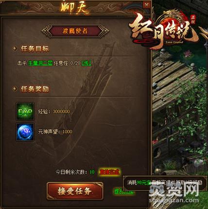 51《红月传说》日常篇:小伙伴们每天上线可先将日常任务完成,每次可获得3000000经验和1000元神声望,想要获得更多经验的,可在任务完成时,消耗100000绑定金币,领取2倍奖励,消耗200000绑定金币,可领取3倍奖励;如果没时间但有元宝的人,可以点击‘直接完成’,但每次需要消耗98元宝并三倍领取奖励。