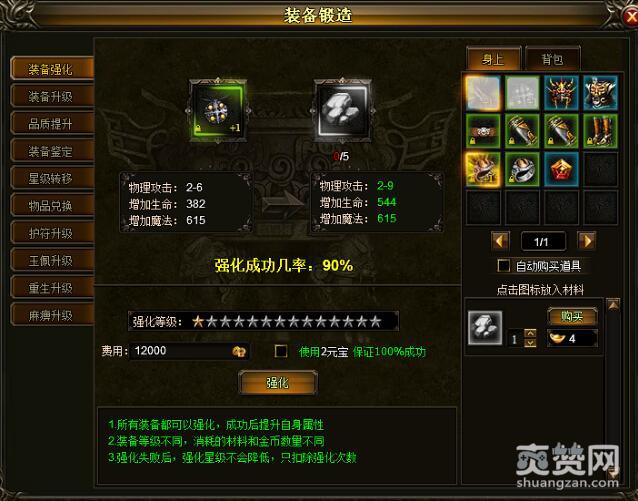 装备强化,装备强化分四个阶段,1级强化石,可强化+1--+4;2级强化石,可强化+5--+8;3级强化石,可强化+9--+12;4级强化石,可强化+13--+15。装备强化等级越高,需要的强化石就越多,升级的成功率也就越低,所有装备最高都可以强化+15。强化装备时,需要消耗对应的金币,强化成功等级+1,强化失败,强化效果不会下降,但是会扣除一颗强化次数。