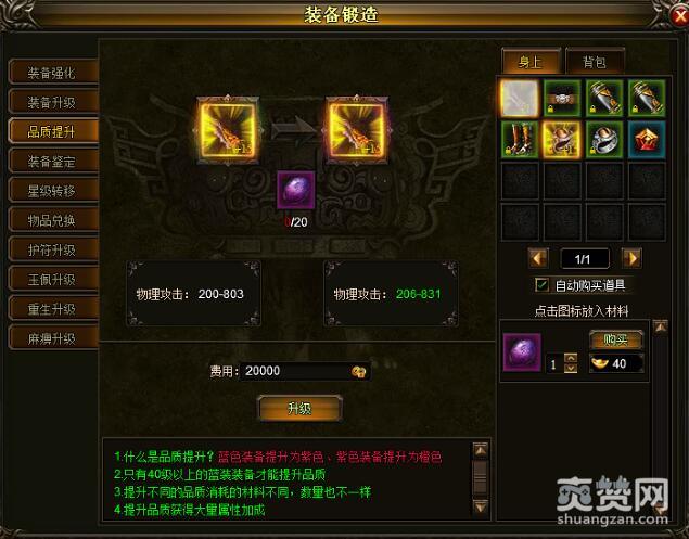 品质提升,是提升装备品质,装备品质越高,属性越强,单击右边的装备就可以进行提升品质了,只有蓝色品质,和紫色品质可以提升,蓝色品质提升为紫色品质,紫色品质提升为橙色品质,40级以上的蓝色装备才可以提升品质,品质提升后,大大增加装备属性,蓝色品质提升为紫色品质时,消耗紫色升级石,紫色品质提升为橙色品质,消耗橙色升级石,提升成功率100%。