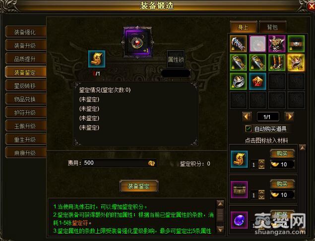 装备鉴定,蓝色品质装备可以鉴定3条属性,紫色装备可以鉴定4条属性,橙色装备可以鉴定5条属性,装备鉴定,可获得附加属性,第一条鉴定属性消耗1张鉴定符,第二条鉴定属性消耗2张鉴定符,依次类推!所鉴定的属性不满意,可以通过清洗沙清洗所有属性,重新鉴定,使用属性锁锁定某条鉴定属性,锁定属性可以不被清洗,并且会有几率增加属性。
