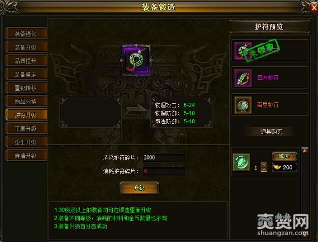 护符升级,玉佩升级,特戒升级,第一次升级是领取,领取之后可以提升装备等级,领取装备,系统会自动穿戴装备,战士可领取“麻痹戒指”和“重生戒指”,法师和道士可领取“护身戒指”和“重生戒指”。