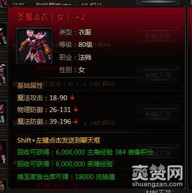 圣魔法衣。80级以上法师可装备。提供魔法攻击18-90点,物理防御26-131点,魔法防御39-196点。