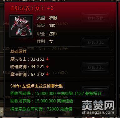 血虹法衣。1转以上法师可装备。提供魔法攻击31-152点,物理防御44-221点,魔法防御67-332点。