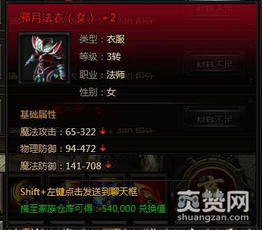 邪月法衣。3转以上法师可装备。提供魔法攻击65-322,物理防御94-472,魔法防御141-708点。