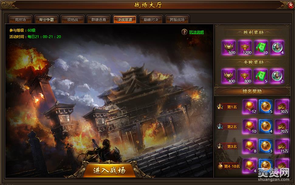 当玩家进入决战官渡活动中后,将会被随机分为红方与蓝方两个阵营,两个阵营互为敌对关系,活动地图中存在小怪和BOSS两种中立怪物,玩家可以通过击杀中立怪物获得积分,击杀敌对阵营的玩家也能获得积分,积分将会记入阵营与个人排名。