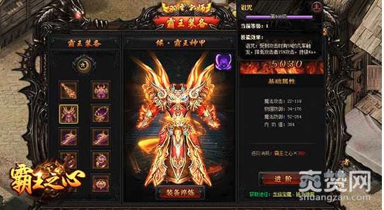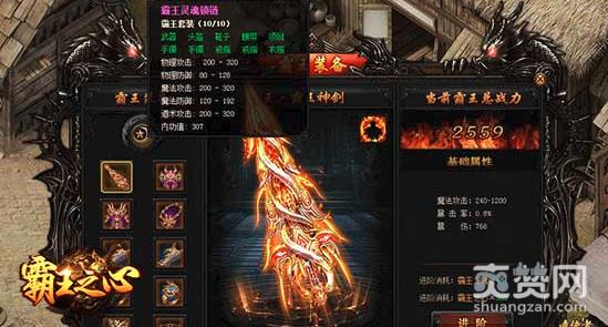 通过游戏主界面上方的图标可以进入霸王装备界面,霸王装备共包含10个部位,与普通装备相同。所有霸王装备都需要使用霸王之心来进阶,进阶后单件装备的属性将会得到提升,当所有部件均进阶到一个阶段时,可以获得霸王灵魂锁链的额外效果。