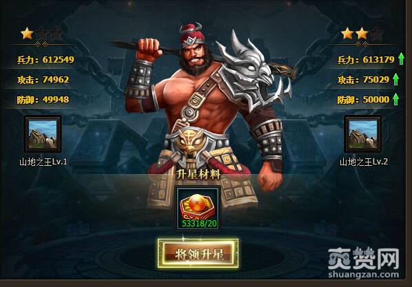 1星升2星,兵力:612549变613179,攻击:74962变75029,防御:49948变50000,山地之王Lv.1变山地之王Lv.2,升星材料需要升星丹20颗,将领需达到10级。