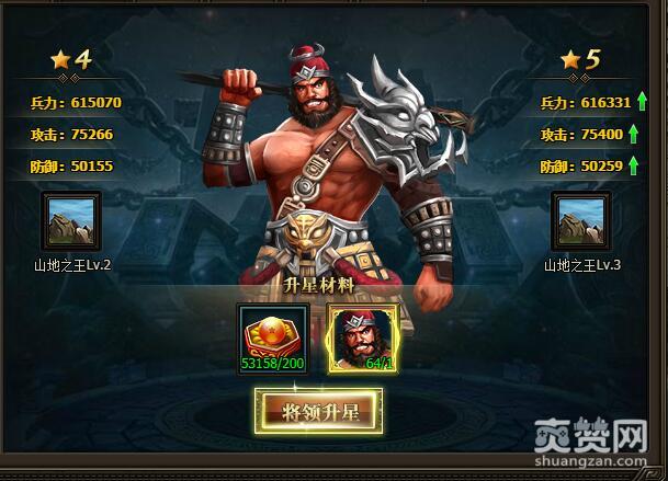 4星升5星,兵力:615070变616331,攻击:75266变75400,防御:50155变50259,山地之王Lv.2变山地之王Lv.3,升星材料需要升星丹200颗,张飞1个,将领需达到40级。