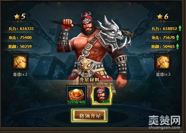 5星升6星,兵力:616331变618852,攻击:75400变75670,防御:50259变50465,盾墙Lv.2变盾墙Lv.3,升星材料需要升星丹400颗,张飞1个,将领需达到50级。