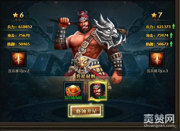 升到60级后,6星升7星,兵力:618852变621373,攻击:75670变75974,防御:50465变50672,厉兵秣马Lv.2变厉兵秣马Lv.3,厉兵秣马Lv.3:攻击+80。