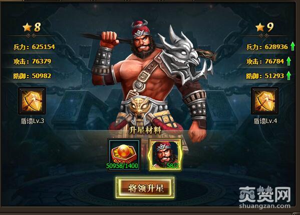 8星升9星,兵力:625154变628936,攻击:76379变76784,防御:50982变51293,盾墙Lv.3变盾墙Lv.4,升星材料需要升星丹1400颗,张飞2个,将领需达到80级。