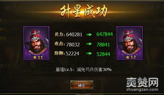 11星升12星,兵力:640281变647844,攻击:78032变78841,防御:52224变52844,盾墙Lv.4变盾墙Lv.5,升星材料需要升星丹4000颗,张飞3个,将领需达到110级。