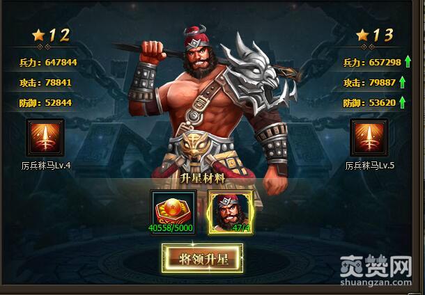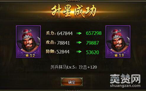 12星升13星,兵力:647844变657298,攻击:78841变79887,防御:52844变53620,厉兵秣马Lv.4变厉兵秣马Lv.5,升星材料需要升星丹5000颗,张飞4个,将领需达到120级。