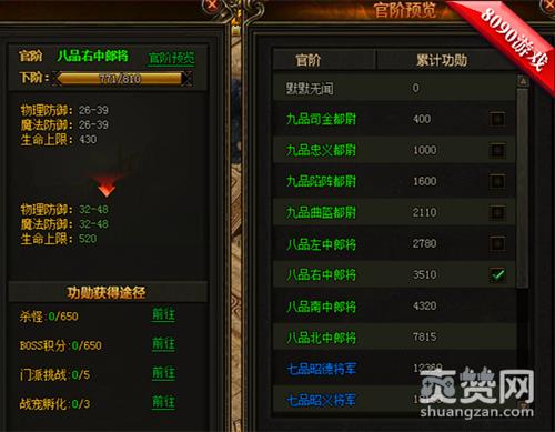 想要提升官职就少不了功勋,你不做出一点成绩来怎么升职加薪呢!所以在8090天地诸神中一共有4个获取功勋的途径,第一个就是杀650个怪,第二个就是击杀boss获得650boss积分,第三个就是门派挑战5次,最后一个就是战宠孵化3次。