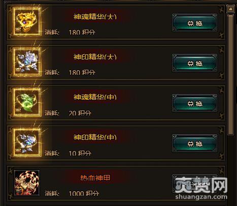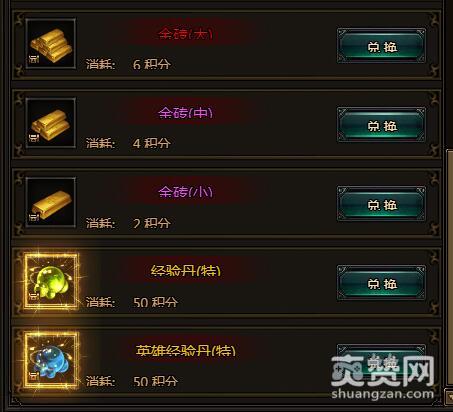 积分装备男女互换一栏中,一共有10件道具。它们分别是:神魂精华(大)、神印精华(大)、神魂精华(中)、神印精华(中)、热血神甲、金砖(大)、金砖(中)、金砖(小)、经验丹(特)、英雄经验丹(特)。消耗积分分别为180积分、180积分、20积分、10积分、1000积分、6积分、4积分、2积分、50积分以及50积分。