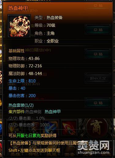 热血神甲。热血装备。70级以上主角可装备。基础属性提升:物理攻击43-86,物理防御:72-216,魔法防御:48-144,生命上限:810,暴击:40,暴击伤害:200。