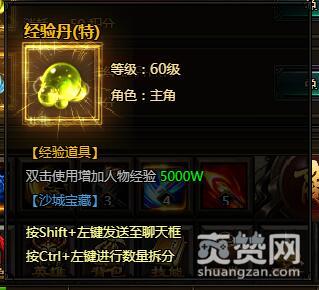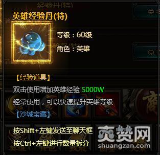 英雄经验丹(特)。双击使用增加英雄经验5000万。经常使用,可以快速提升英雄等级。
