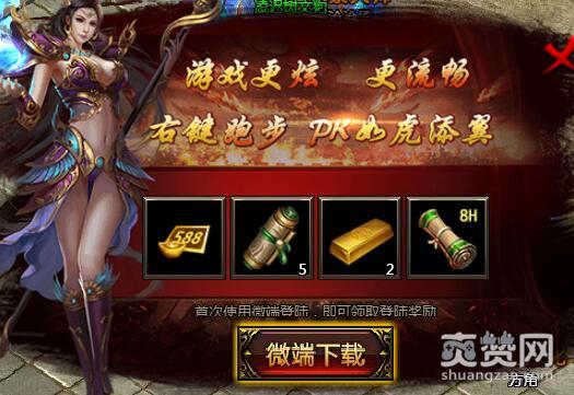 微端下载后的奖励主要有588礼券、副本卷轴*5、金砖(小)*2、2倍经验卷轴(8小时)*1。