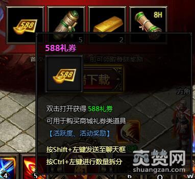 588礼券。双击打开获得588礼券,可用于购买商城礼券类道具。