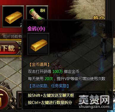 金砖(小)。双击打开获得100万绑定金币。每天使用20次,提升VIP等级可增加使用次数。