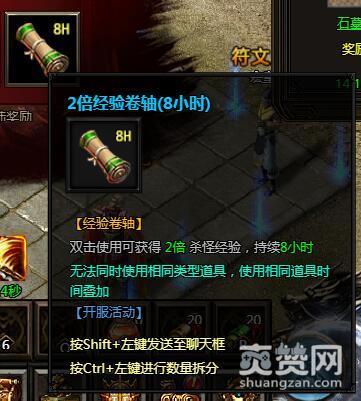 2倍经验卷轴(8小时)。双击使用可获得2倍杀怪经验,持续8小时。无法同时使用相同类型道具,使用相同道具时间叠加。