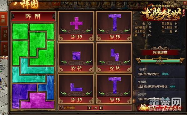 八阵图是传奇世界网页版《龙腾传世》特有的战斗神器。根据等级和境界级别,八阵图开放蛇蟠阵、鸟翔阵、虎翼阵、龙飞阵、云垂阵5档阵法。从普通到完美至尊的5个品质,是拉大你与普通玩家之间战斗力鸿沟的无上法宝。品质越高的阵法可提升的等级也越高,简直就是不给别人活路,填满阵图还可激活特殊属性,一阵在手天下我有。