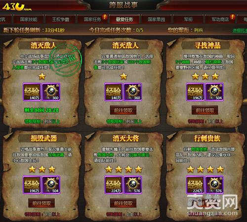 43u《龙之女神》悬赏任务时间为12:00-24:00,活动期间每小时会刷新6个任务,任务刷新超过半小时则不可以接取任务。每个任务只能由本国的1名玩家领取,军衔越高,可领取任务难度星级越高。奖励也就越好,所以小伙伴们要在接取任务后半小时之内完成任务哈!
