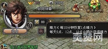 923yx《霸王之心》中有一个精力系统,当大家每次攻击怪物时都会消耗一定的精力值,当精力值为0的时候,就不能再对怪物攻击。精力值每10分钟就可以恢复一点,若是大家等不急的话,也可以用元宝购买精力。