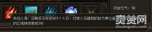 真·赤焰火海:召唤投石车投放5个火石,对被火石砸到的敌方单位造成伤害,投放火石的区域持续燃烧3秒,死亡后再放一次技能。 获得方式:兵器升1阶
