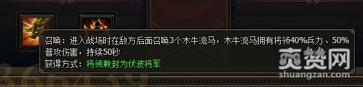 召唤:进入战场时在敌方后面召唤3个木牛流马,木牛流马拥有将领40%兵力、50%普攻伤害,持续50秒 获得方式:将领敕封为伏波将军