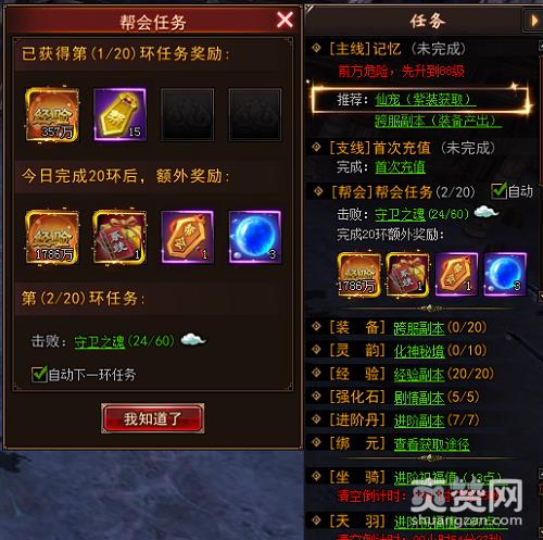 帮会任务每天是20环,完成20环后可以获得经验1786万;帮会任务技能书礼包,坐骑、天羽、神兵、法宝、神识、境界、足迹、法盾、仙班、图腾技能书增加技能;帮会令,可在帮会面板中进行捐款,捐款后可获得100点帮贡;元魂丹,可在帮会BOSS面板喂养帮会BOSS,提升BOSS等级,每颗提升BOSS等级经验10点。这样可以获得更多的任务经验,加快升级的速度哦。